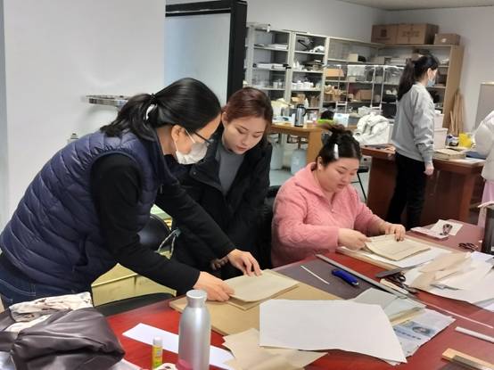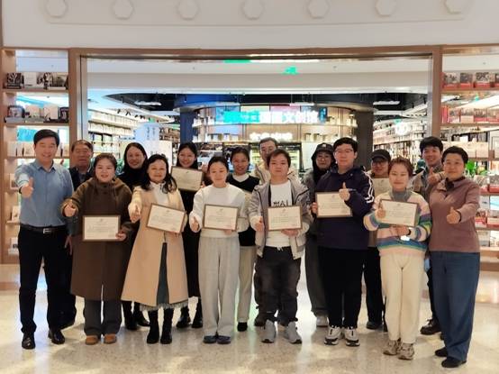 为强化实践教学成效,培训班将接近一半的课程设置为动手实操环节。学员走进国家图书馆专业古籍修复教室,在资深教师的带领下,亲手体验经折装、蝴蝶装、线装等传统装帧技法。教师团队逐一示范、细致指导,助教全程辅助,确保每位学员精准掌握技艺精髓。课程还特别组织学员走进国图文创馆(魏公芳华里店),实地感受这一融合阅读、展览与文创消费的复合文化空间。在充满设计感的环境中,学员们不仅深入了解了典籍元素如何转化为文创灵感,还纷纷选购了以古籍纹样、经典复刻为主题的文化创意产品,如仿古笔记本、典籍书签等,亲身体验“让古籍走进生活”的文创理念。